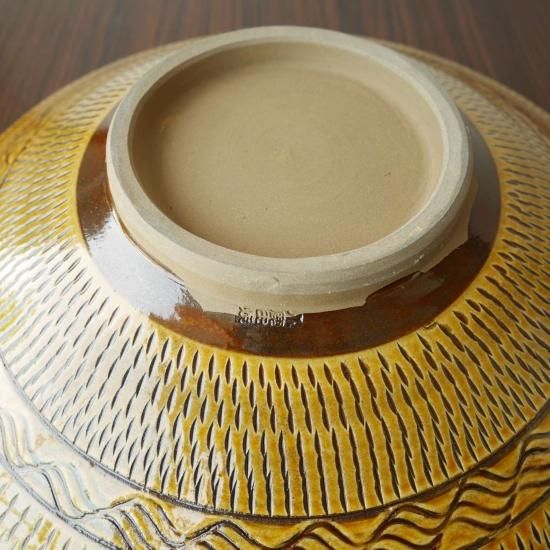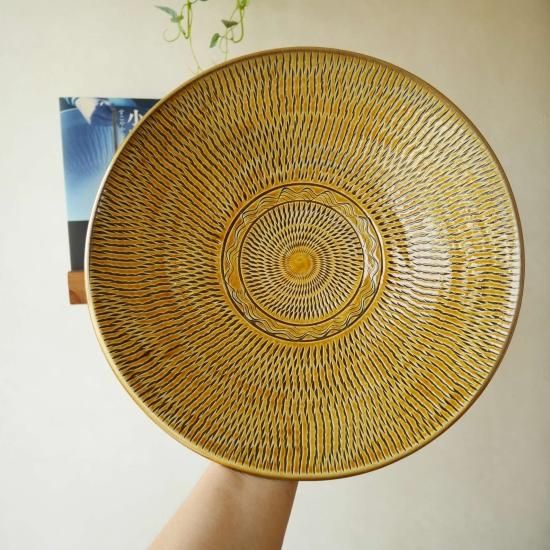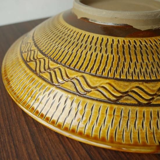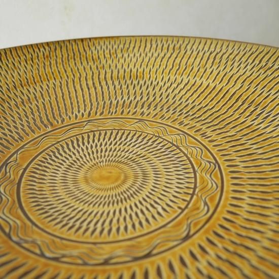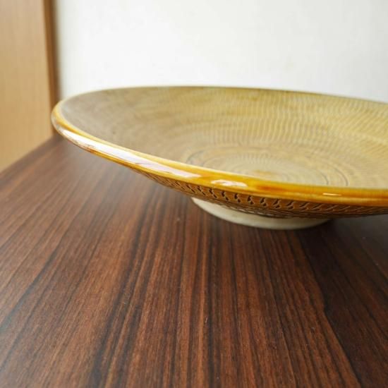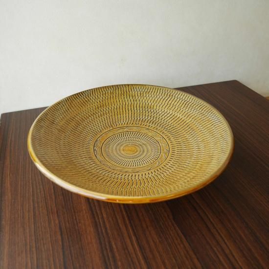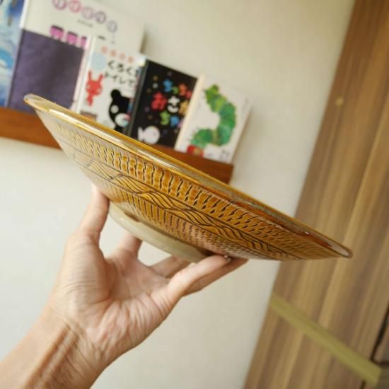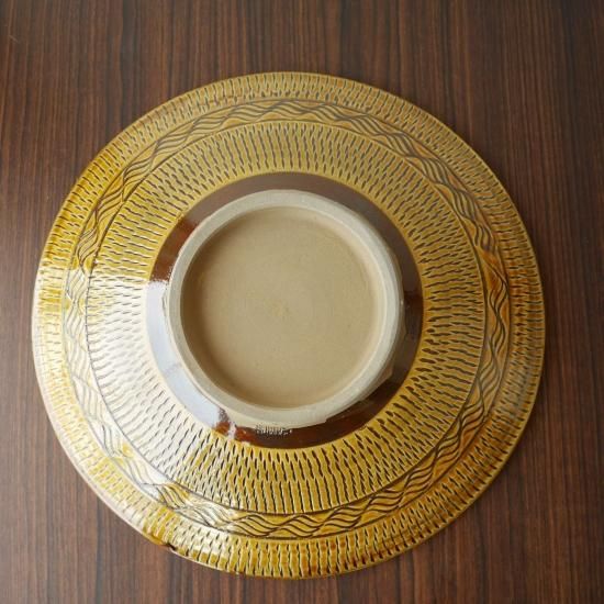 明るい茶色ベースにとびかんな、櫛目模様が施された立派な尺皿です。メインの大皿料理は勿論、お鍋の具材皿として贅沢にお楽しみいただけます。大きさに反してとても軽く、つくり手さんの技術力の高さを感じます。