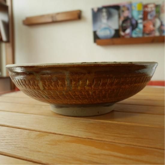 焼く時にお皿とお皿を伏せ合わせているのでフチが有り、その為フチには釉薬が付いていません。大きな切り立ち鉢で深さも有りますのでメインの盛り鉢としてたっぷりとお使いいただけます。高台に窯傷が有りますが欠けている訳では有りませんのでご使用には問題無いと思います。