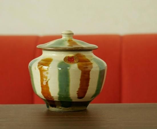 白地に緑と茶色の釉薬が可愛らしい小壷になります。