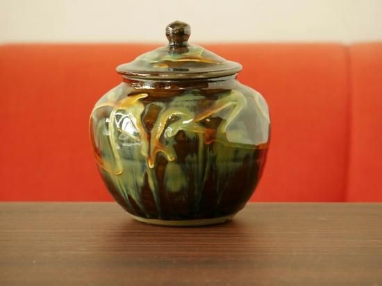 茶色ベースに白土と青の釉薬をかけてあります。釉薬もよく動き写真ではお伝えきれない素晴らしい魅力があります。鑑賞用としてよいくらいですが、やはり使わなければ物が泣くので保存の容器としてお使い下さいませ。