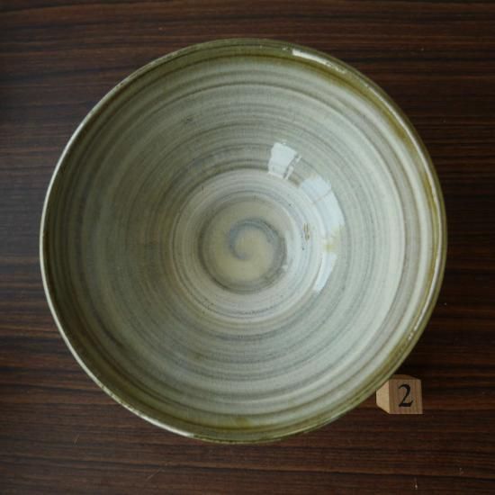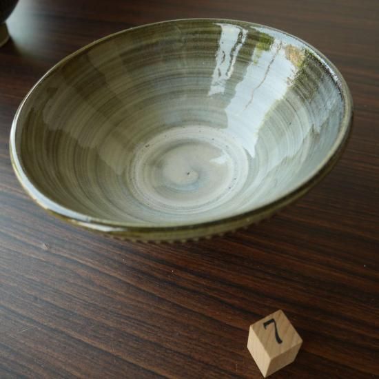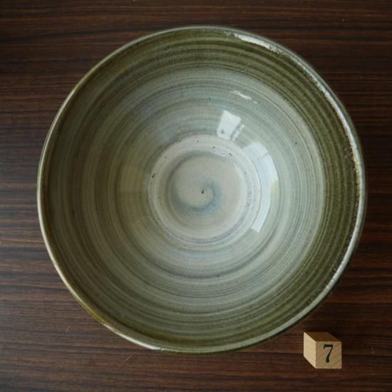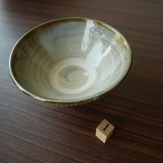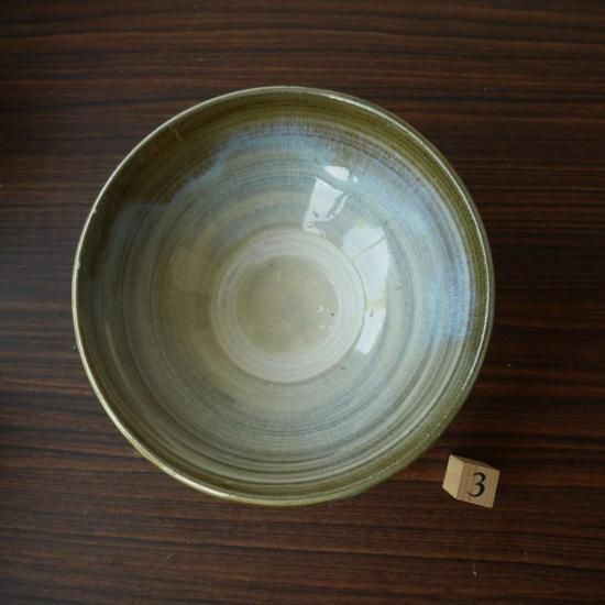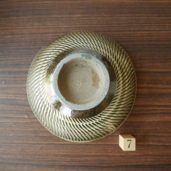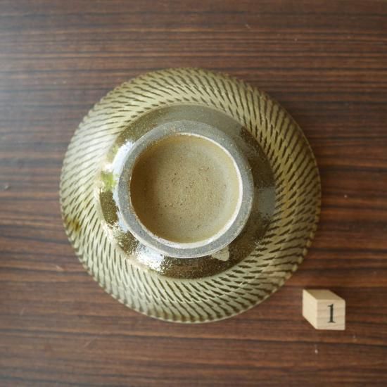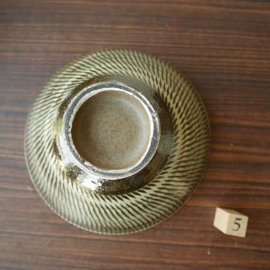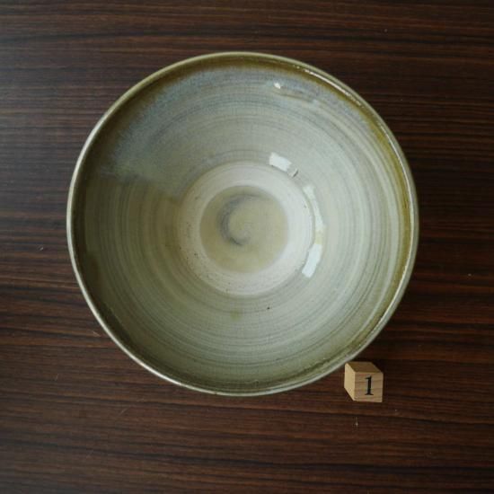 大き目のご飯茶碗なので、小どんぶりっぽさもえります。薄緑の釉薬が掛けられたのてすが、みっちり焼かれてグレーっぽい色に窯変しています。コチラは小鹿田の印有りタイプです。