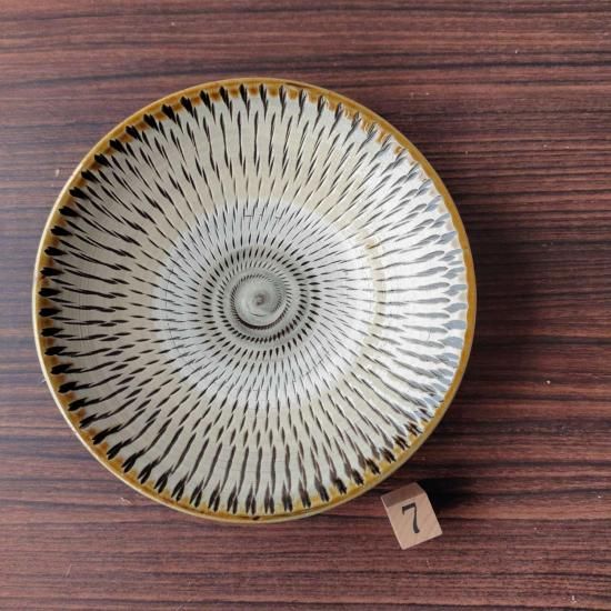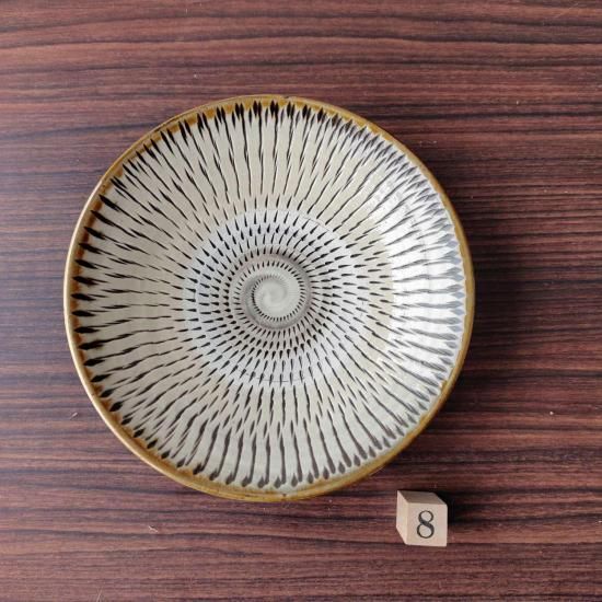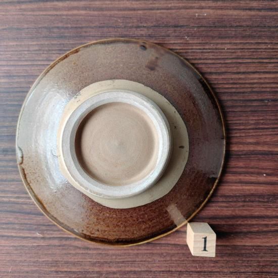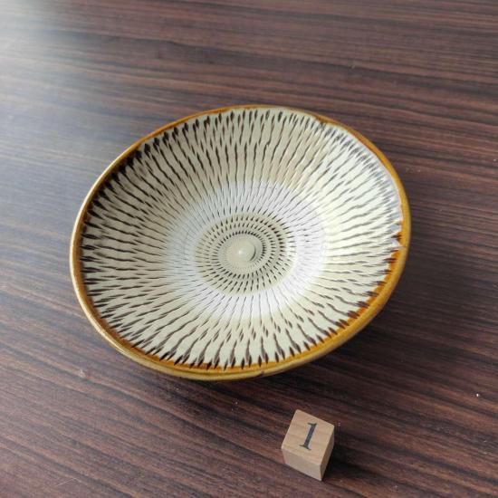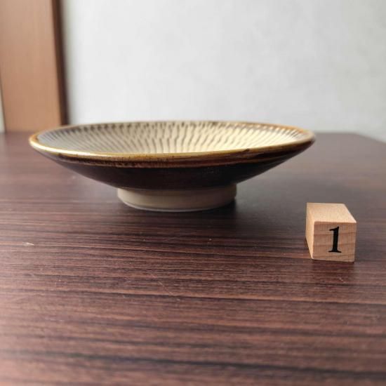 とびかんなでフチに茶色の釉薬がついている小皿です。ベーシックなデザインなので飽きも無く長くお使いいただけます。