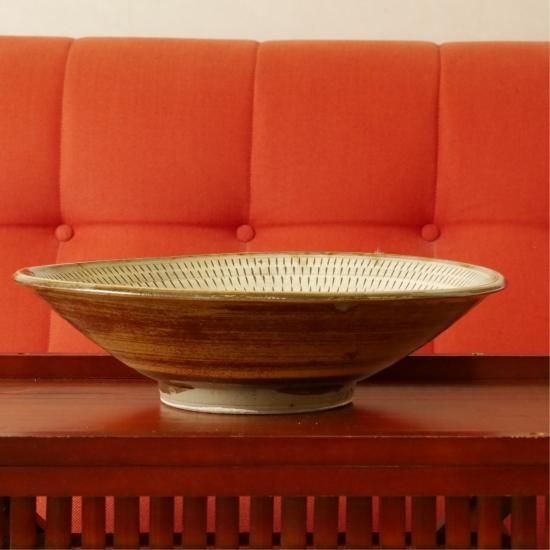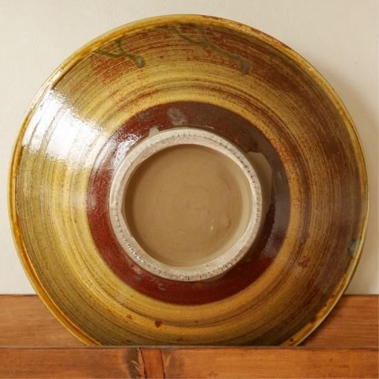 釉薬の感じからして6年以上は前の物だと思います。表は爽やかな薄いグリーンが優しく、裏面は黄色と赤でとてもカッコイイとびかんなの大皿です。裕之さんのとびかんなが主張し過ぎなく、「使える」尺皿です。深さも程よく有るので用途も幅広く、色は食との相性も抜群なので豪華に食卓を演出してくれると思います。使わない時は写真の様に立てておいてもインテリアとして活躍してくれます。