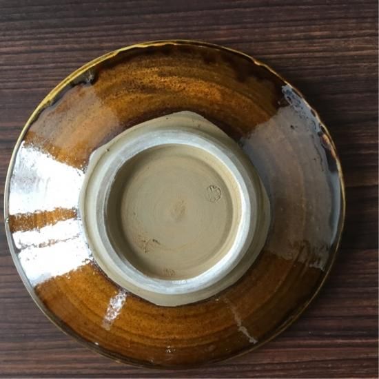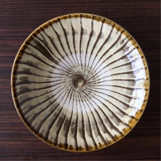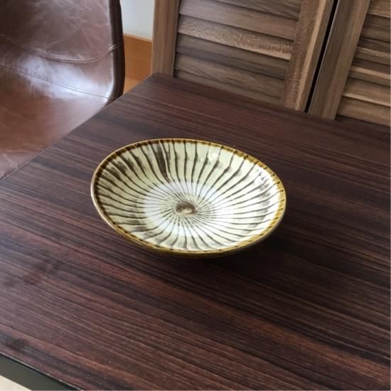 はけめにフチが茶色の釉薬のついているお皿です。ベーシックなので飽きが来なく、ながくお使いいただけると思います。裏は格好良く表は白地が優しくミルキーでとても素敵な仕上がりです。