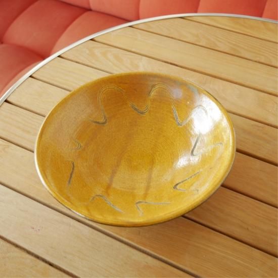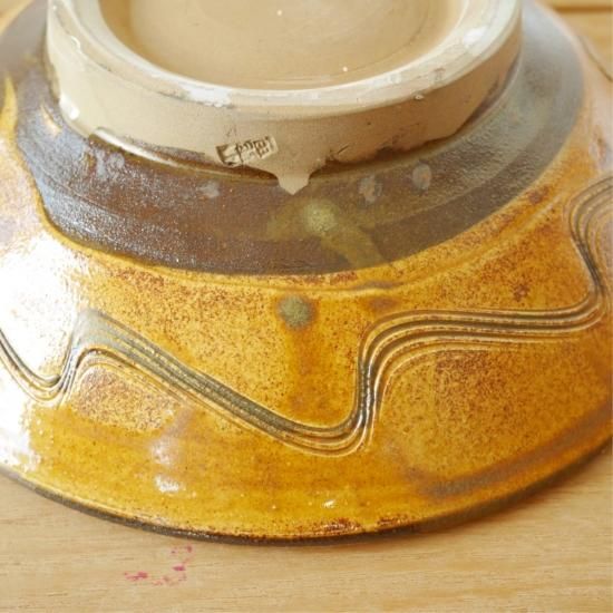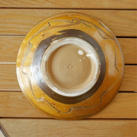 お皿の中央付近に白い目の無い上乗せ分になります。朝夫窯の茶色のお皿は、上乗せ分のみなので数の少ない貴重な1枚です。シンプルに櫛目だけの裕之さん定番の人気の有る物の山吹色タイプで少しマットな質感が趣ある仕上がりとなっています。