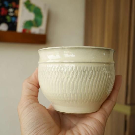 白カンナリーズのマグカップのハンドルが無しタイプです。別売りの茶色タイプと合わせたり、色々な用途でお楽しみください。