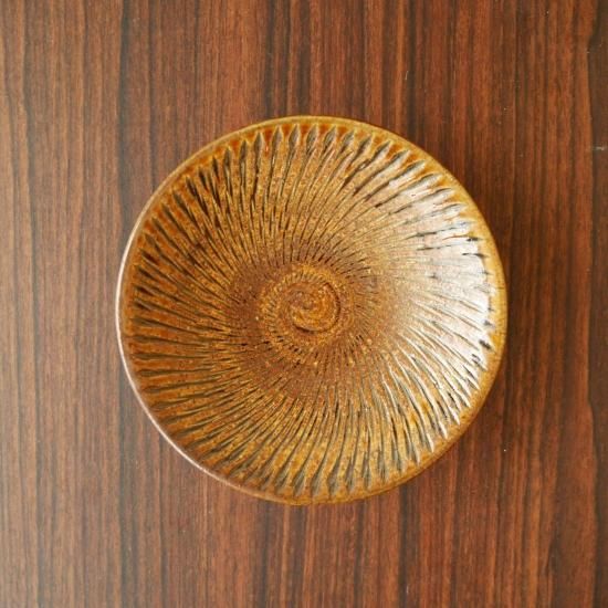 とびかんなで茶色釉薬の蛇の目が無い上乗せ分の小皿です。ベーシックなデザインなので飽きも無く長くお使いいただけます。