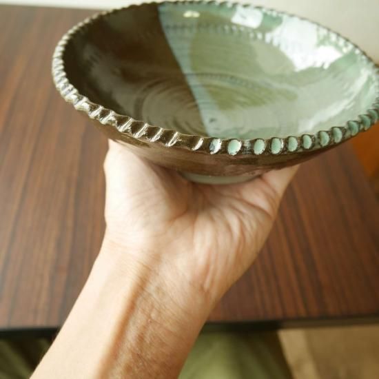 小袋窯で先々代から作られていた技法で、フチ部分がナミナミ状になったお鉢です。半面は青でモダンな雰囲気でオススメです。