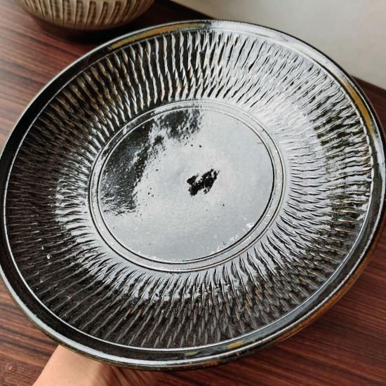 小袋窯の真黒釉に、中抜きとびかんなデザインの大皿です。とびかんなの溝に入った釉薬が茶色く窯変している景色がとても良いです。数少ないレアな蛇の目無しタイプです。