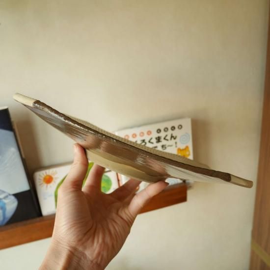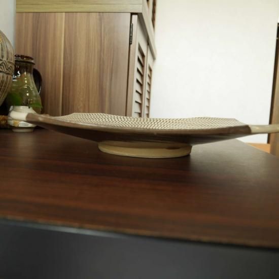 4面を切り落としたかたちの切り皿で、食卓に変化をつけられます。小鹿田焼の尺サイズではありえないくらいのひらた目で素晴らしい仕上がりです、幅広い用途でお使いいただけると思います。