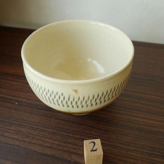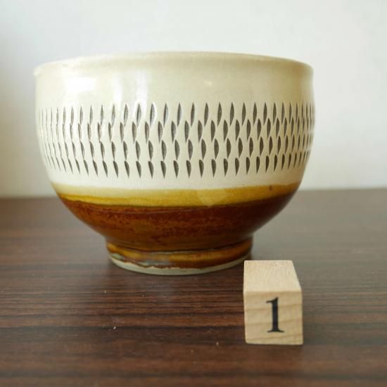 とびかんなを施した、上下釉薬掛け分けの丸小鉢です。