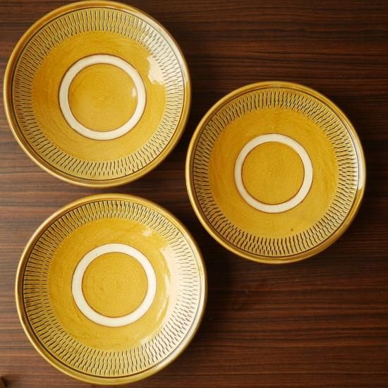 鮮やかな山吹色のがとても魅力です。少し歪みが有りますが、高台をしっかり削りガタつきはほとんど修整しておりますのでさほど気になら無いと思います。写真で確認いただけますが在庫3枚ともどれも同じ様に魅力的です。