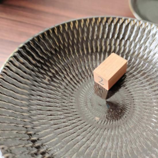 小袋窯の真黒釉のとびかんなの小皿です。とびかんなの溝に入った真黒釉が一部茶色に窯変しています。数少ないレアな蛇の目無しタイプです。