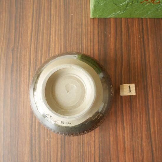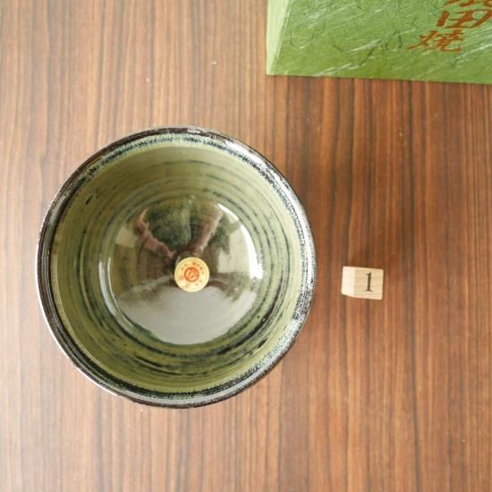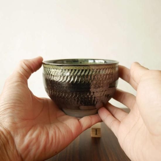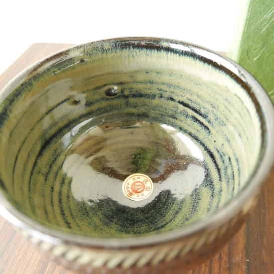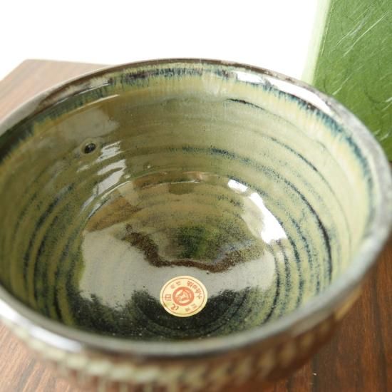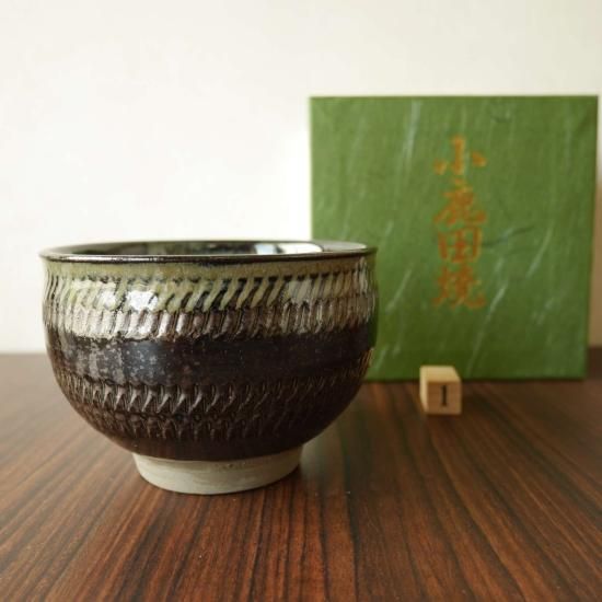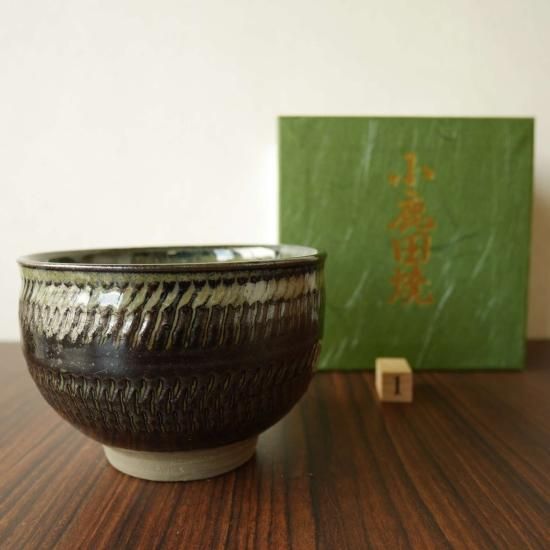 気軽に家庭用として使える価格帯のお抹茶碗です。収納用に小鹿田焼がプリントされた紙の箱付きです。裏の印は、「小鹿田焼」と小袋窯が代々使っている「鹿峰」になっていると思います。私は抹茶碗等の茶器の知識は全く有りませんので写真からご判断下さいませ。紙箱の汚れや、器を包む紙やクッション材等も窯元さんから届いた物のままですのでご理解の上ご購入下さいませ。