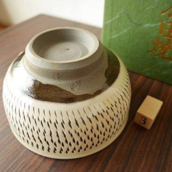 気軽に家庭用として使える価格帯のお抹茶碗です。収納用に小鹿田焼がプリントされた紙の箱付きです。裏の印は、「小鹿田焼」と小袋窯が代々使っている「鹿峰」になっていると思います。私は抹茶碗等の茶器の知識は全く有りませんので写真からご判断下さいませ。紙箱の汚れや、器を包む紙やクッション材等も窯元さんから届いた物のままですのでご理解の上ご購入下さいませ。