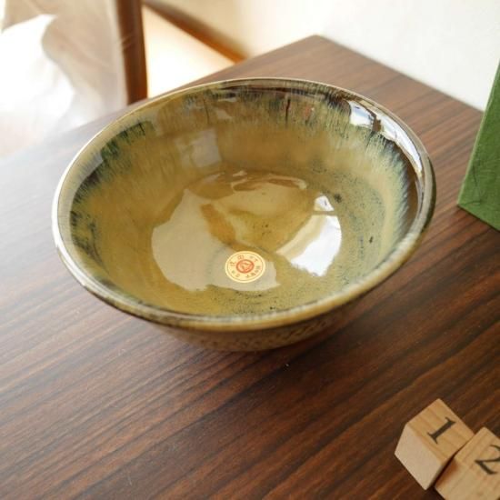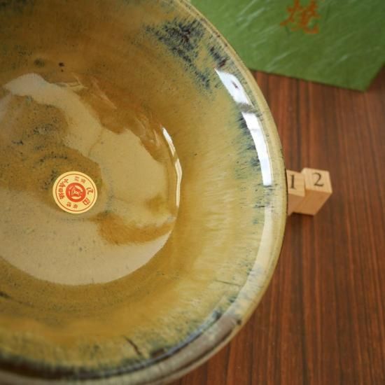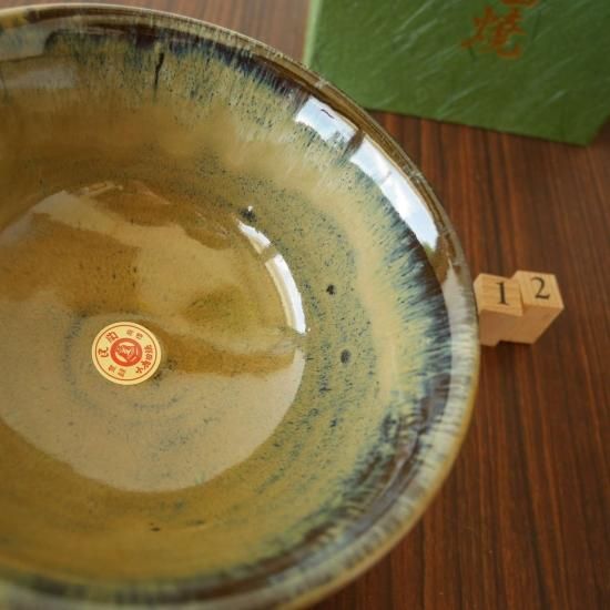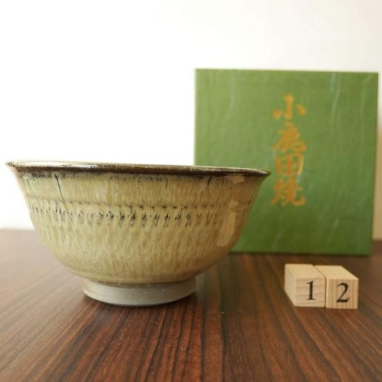 気軽に家庭用として使える価格帯のお抹茶碗です。収納用に小鹿田焼がプリントされた紙の箱付きです。裏の印は、「小鹿田焼」と小袋窯が代々使っている「鹿峰」になっていると思います。私は抹茶碗等の茶器の知識は全く有りませんので写真からご判断下さいませ。紙箱の汚れや、器を包む紙やクッション材等も窯元さんから届いた物のままですのでご理解の上ご購入下さいませ。
