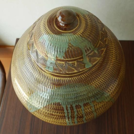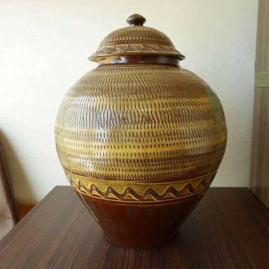 約(重さ6.6kg高さ45センチ蓋無し36センチ横幅33センチ口径14センチセンチ、蓋高さ9センチ直径19センチ「最大円周104センチ底円周53首クビレ円周52センチ」)