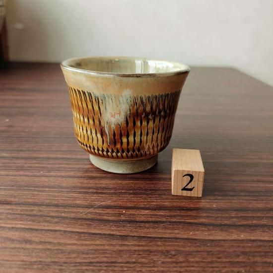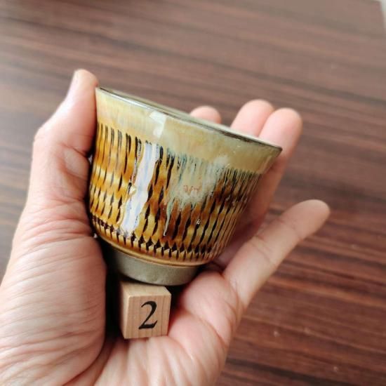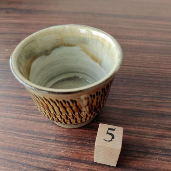 外側の茶色がとても美しい、とびかんなのぐい呑みです。内側に雪崩れた釉薬を見ながら、お酒が美味しくいただけそうです。とてもおすすめです。