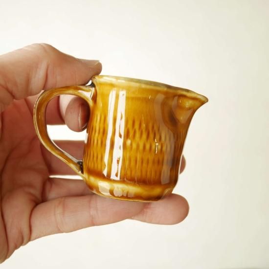 とてもカワイイサイズ感のミルクピッチャーです。小さい物は細かい仕事になるので、作るのが難しいそうですがこの辺りの仕事は、小袋製陶所ならでの流石と言う出来です。プチッと開けて使うタイプのフレッシュが3〜4個分くらいは入りそうなサイズです。