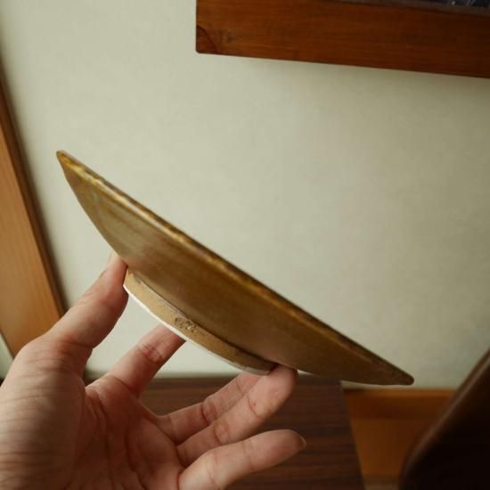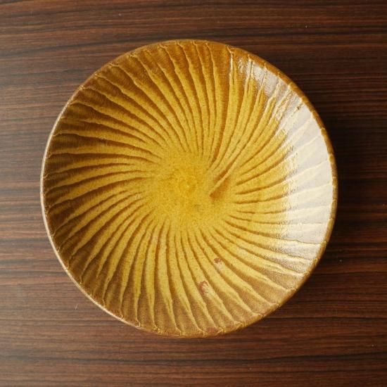 明るい茶色の上乗せ分で蛇の目無しの打ちはけめ模様の中皿です。入荷分5枚はどれも大差無い仕上がりです。