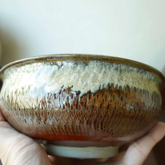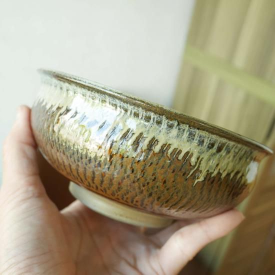 小鹿田焼は基本的には全て手作業です。轆轤をまわし1つ1つ手作りです。登り窯で焼いているので全く同じものは1つとしてないです。窯に入れて置く位置、入れる窯の順位、その時の炎の具合等色々な要素で同じように作り同じ窯で焼いても仕上がりは1つ1つ違います。機械で作っている様なキッチリした見た目のものが好きな方、細かい事(デザインの違い、歪み、ザラつき、色むら、高台のひっつき跡、ひっつき傷を含めた窯傷等)が気になる方はくれぐれもご購入をお控え下さいませ。
