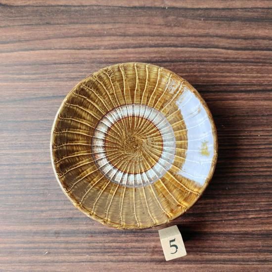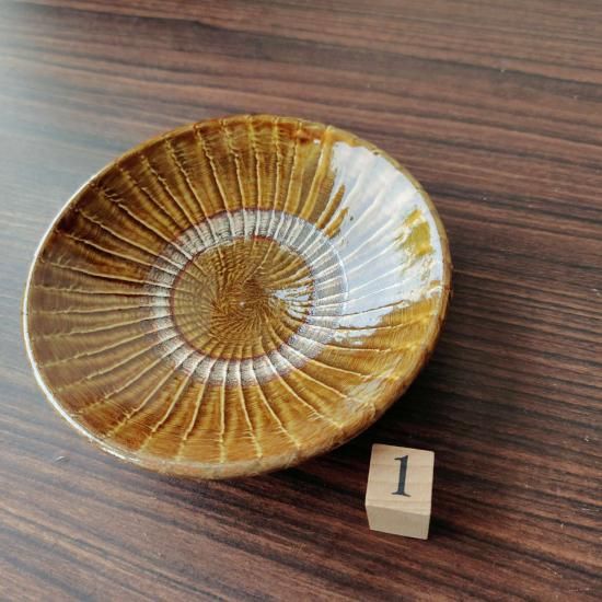 茶色でかわいい、打ち刷毛目模様の小皿です。小鹿田焼印は全てに有ります。