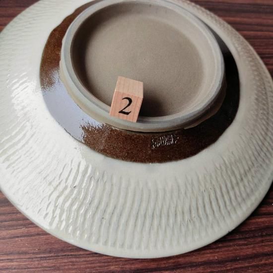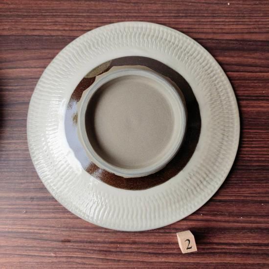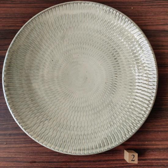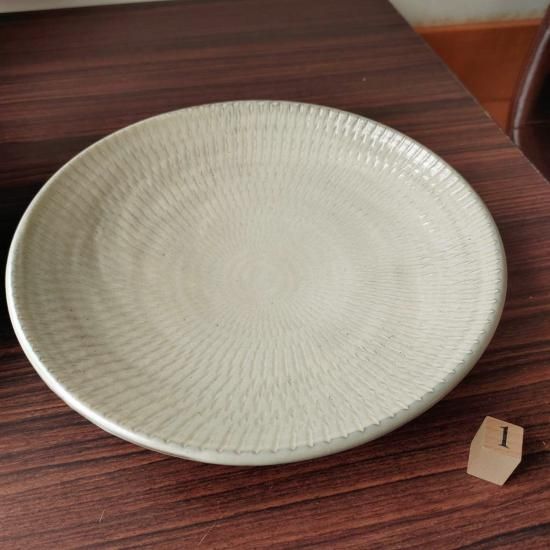 先にとびかんなを施した後に、白の化粧土と透明釉薬をかけたモダンなデザインの大皿です。数少ないレアな蛇の目無しタイプです。1番は少しだけ歪み有ります。
