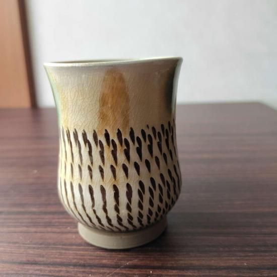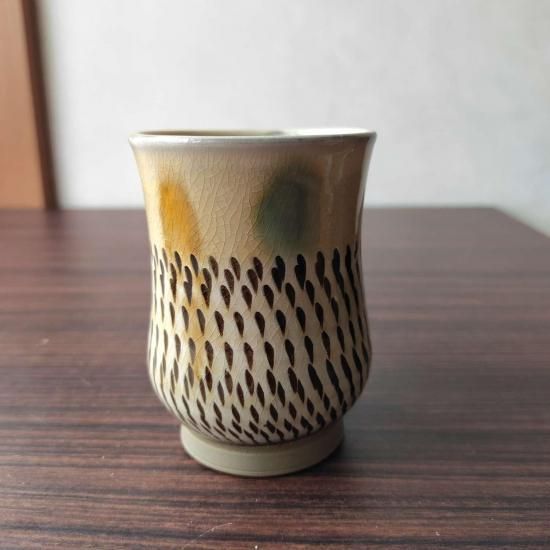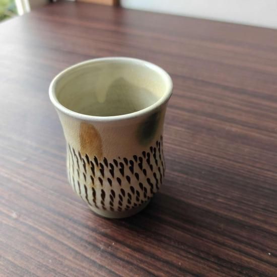 クリームっぽい白色で、2色の釉薬を点打ちした、とびかんなの湯のみです。