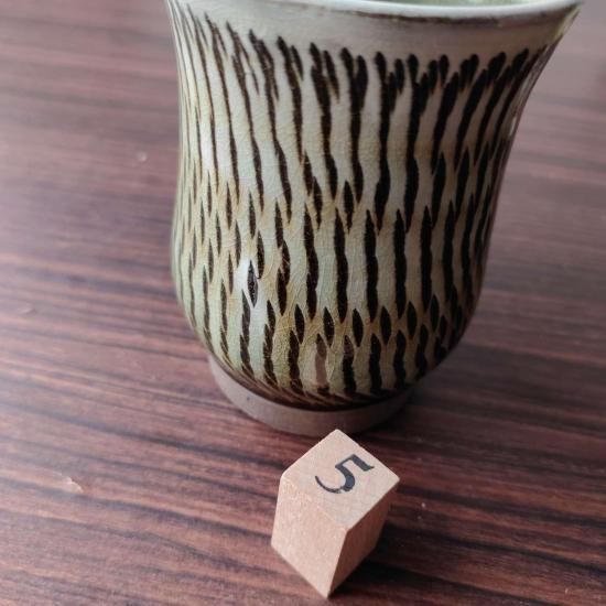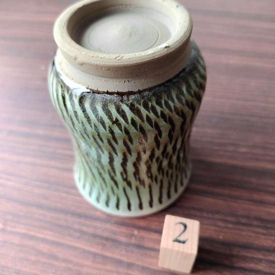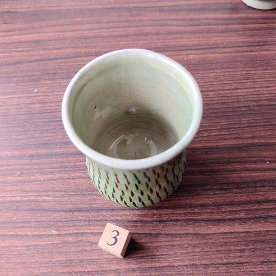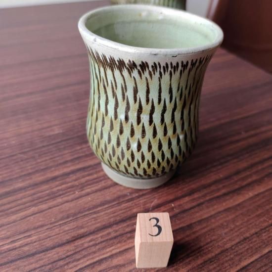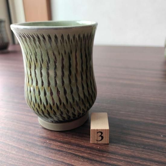 緑色のとびかんなの湯のみです。火膨れとザラつきが、有るのでお買い得品です。ご使用には問題無いので趣きが有る商品だと思って下さいませ。窯元さんでは通常品扱いです。